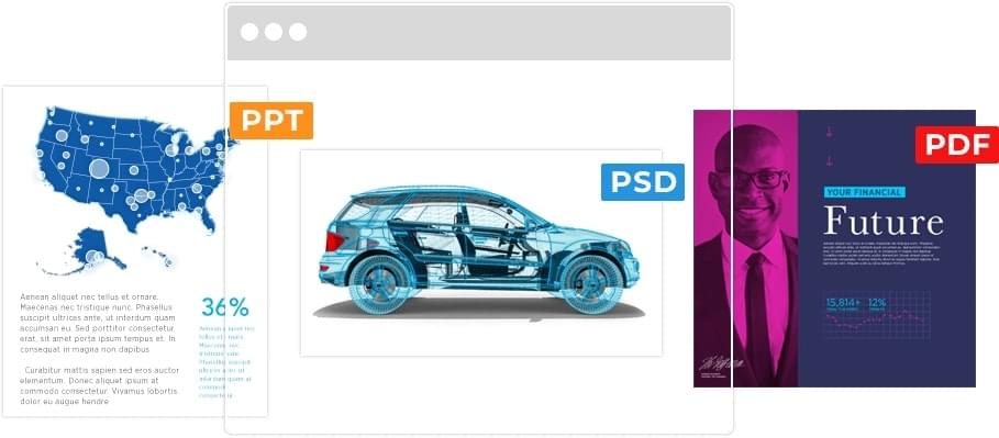 Viewers access documents in the file formats that they’re accustomed to including PDF, Word, PowerPoint, Excel, Plain text, and Adobe Illustrator and Adobe Photoshop files.